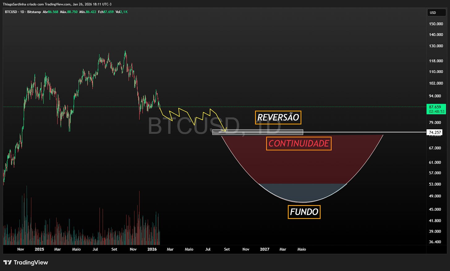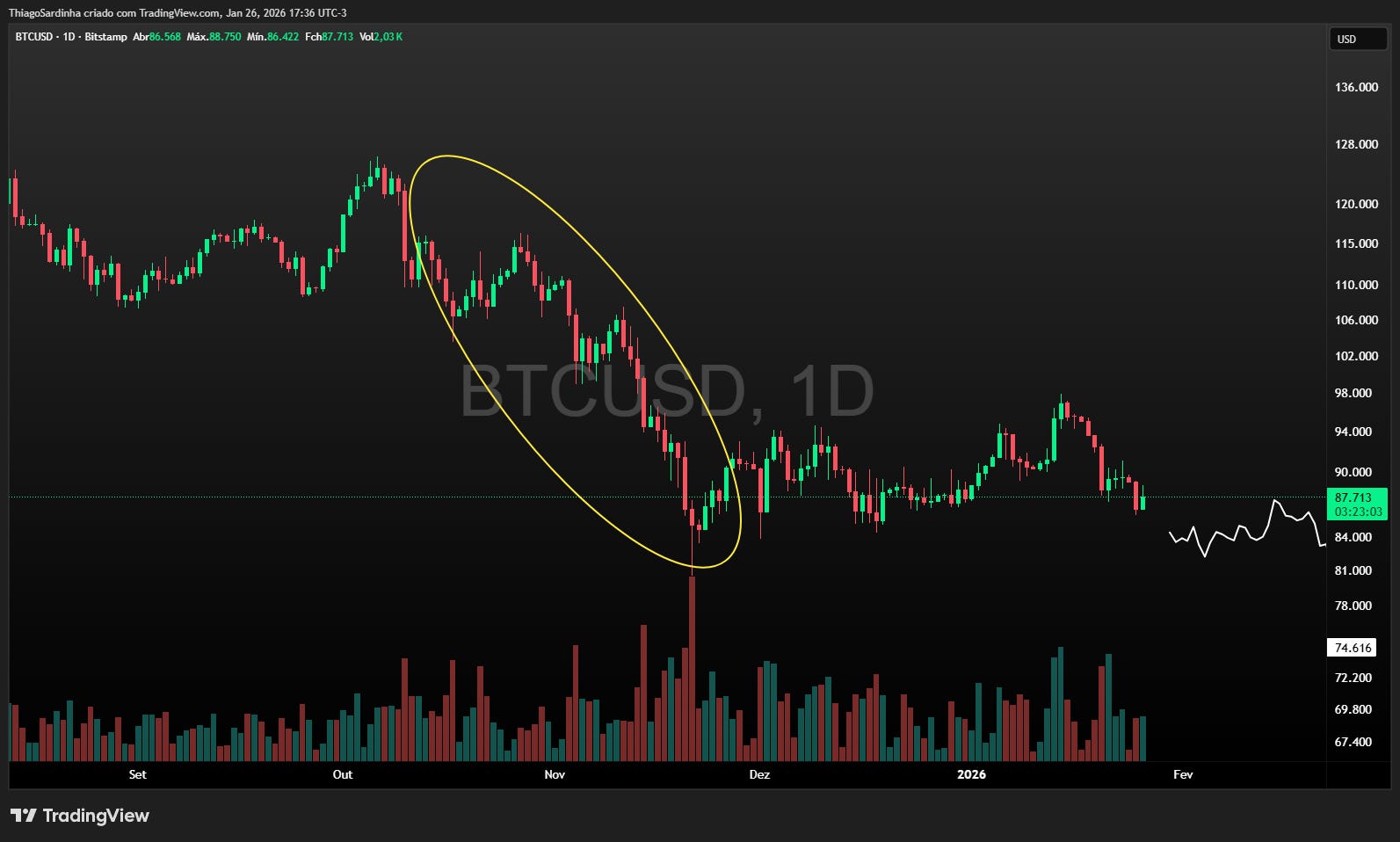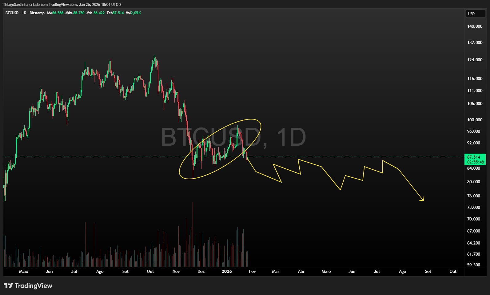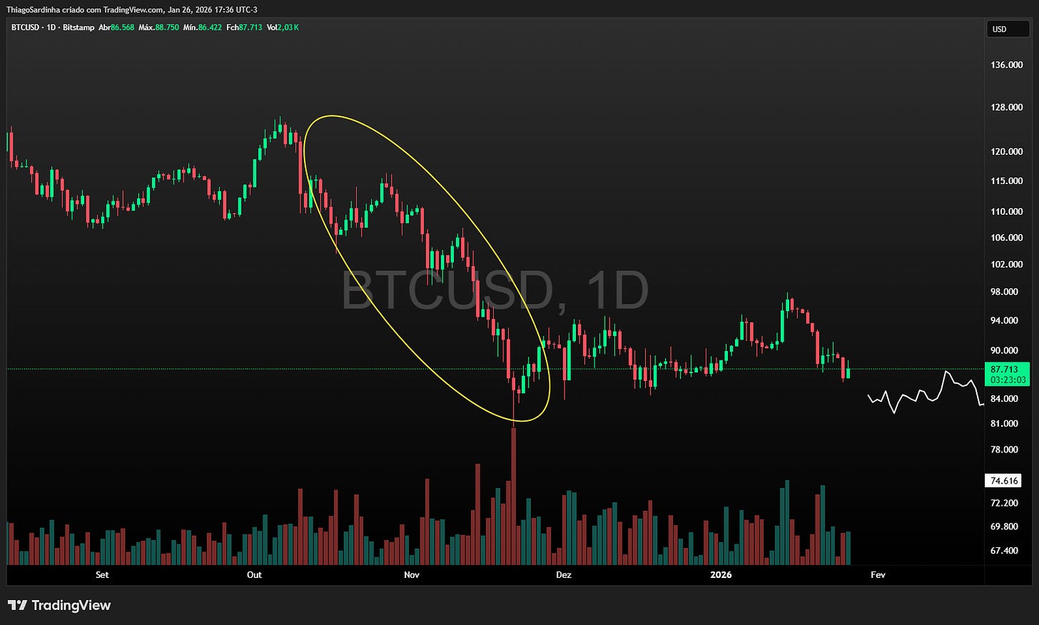 Voltando ao gráfico, em março de 2025 foi possível antecipar o topo na zona de U$120,000. Desde então tudo que estamos vendo é apenas o resultado da distribuição que iniciou em outubro. O preço dá alguns repiques e logo depois renova fundo. E mais uma vez: os momentos de queda são mais agressivos que os momentos de recuperação. E esse também é um padrão gráfico que se deve observar, pois é típico de mercado em baixa, assim como seu oposto é típico de bullrun.