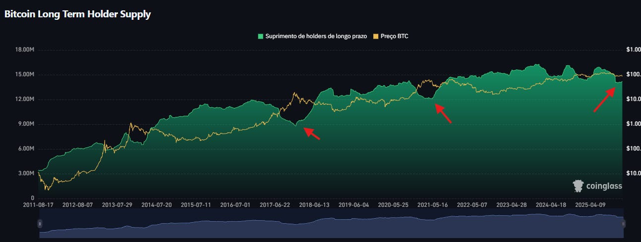 Será vital que nessa fase os dados on-chain comecem a sinalizar reversão, como por exemplo o retorno de grandes compras pelos LTs e fuga extrema do varejo.